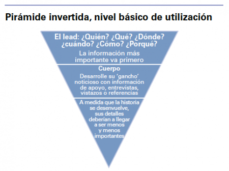 La imagen fue tomada del e-book Cómo escribir para la Web de Guillermo Franco, la característica de ésta estructura es que en el LEAD contiene la información clave de la noticia y responde las 5 preguntas esenciales de la nota.