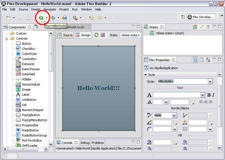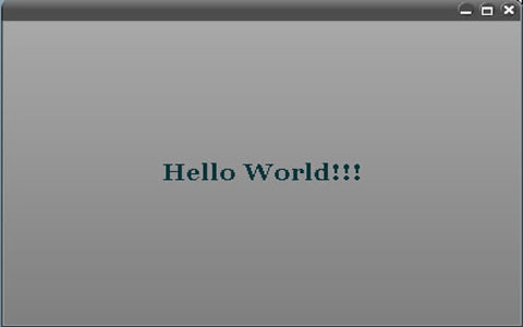 <?xml version="1.0" encoding="utf-8"?> <mx:ApolloApplication xmlns:mx="http://www.adobe.com/2006/mxml" layout="absolute"> <mx:Label text="Hello World!!!" horizontalCenter="0" verticalCenter="0" fontFamily="Georgia" fontSize="20" fontWeight="bold"/> </mx:ApolloApplication>