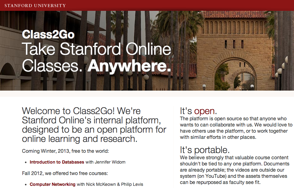 Denominada Class2Go es la propuesta abierta de Stanford diseñada para investigar y aprender. Al ser un proyecto Open Source cualquiera puede colaborar y utilizarla. Además, hacen uso de YouTube, MySQL, Python, Amazon AWS, Opscode, Popcorn.js y el código de la plataforma está disponible en Github.