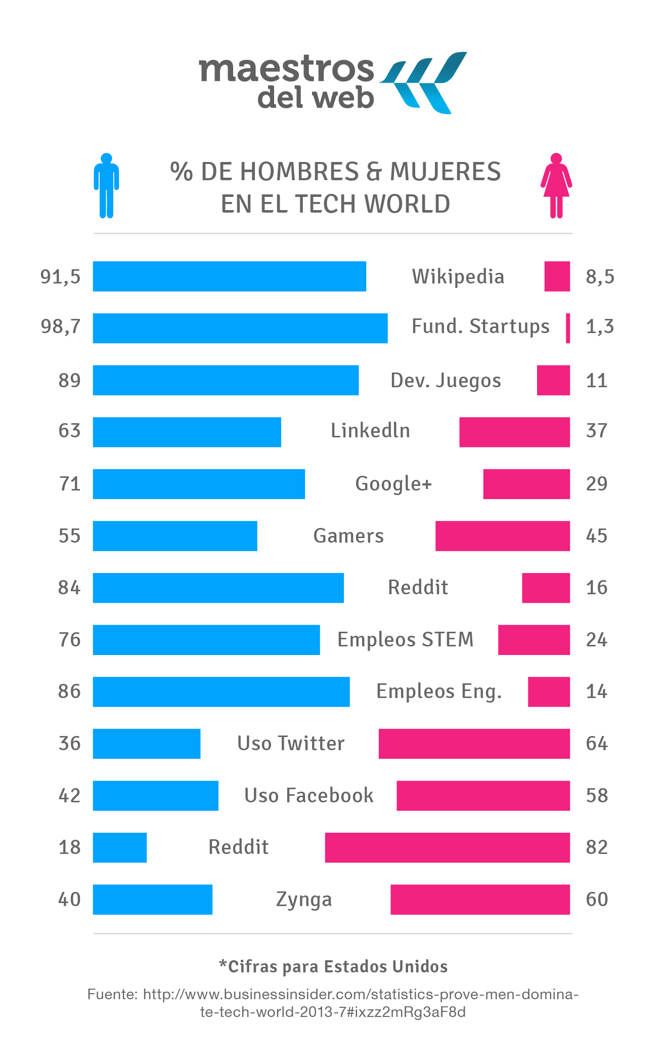 1. La cruda realidad es que el mundo tecnológico sigue dominado por la testosterona: dentro de la lista Forbes de las 100 personas más ricas del mundo, apenas 11 son mujeres y sólo una de ellas está involucrada (por una feliz casualidad) con el mundo tecnológico: se trata de Laurene Powell, la viuda de Steve Jobs. Mientras que en este mismo listado resuenan los nombres de hombres que no requieren presentación, como Jeff Bezzos, Larry Page, Sergey Brin, Mark Zuckerberg, Michael Dell, Steve Ballmer, Bill Gates y Larry Ellison.