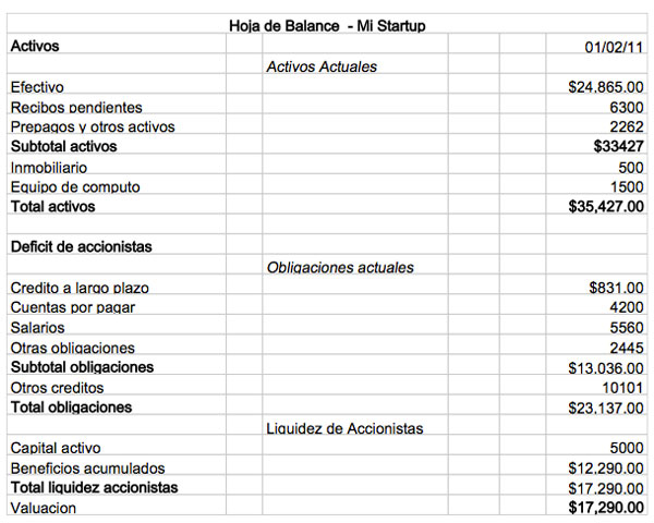 En la hoja de balance debes registrar el balance de tu cuenta de cheques, el dinero que te deben tus clientes e inmuebles que sean de tu propiedad. Más importante aún son las deudas y recibos que has generado al operar tu negocio. ¿Por qué debo llevar todo esto? Por que si algún día quieres demostrarle a un potencial inversor el valor de tu empresa, de aquí sale el resultado de tu valuación.